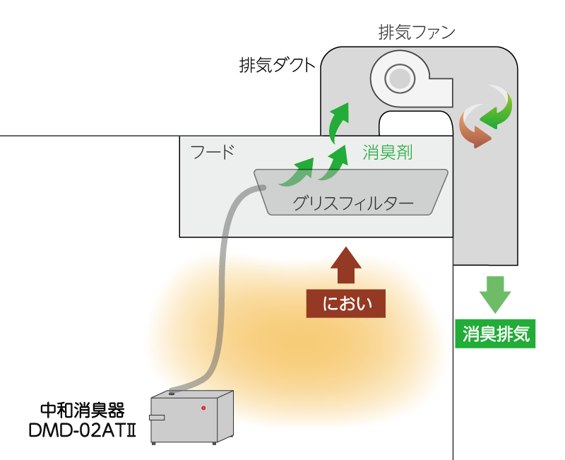 厨房排気脱臭の商品一覧はこちら >こちらに導入したDMD-02ATⅡは、サイズは小さいが業務用の脱臭装置として幅広い用途に使える一台です。