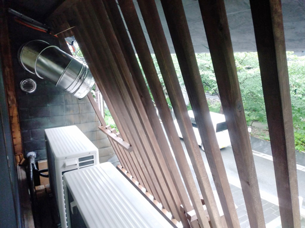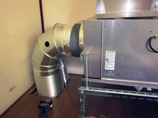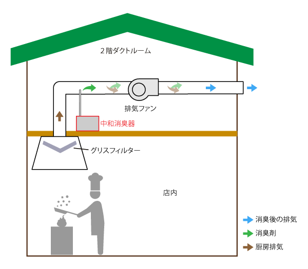 2階のダクトルームに中和消臭器を設置し、排気ダクトの途中に消臭剤を挿入しました。