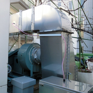 既設の排気設備に組み込むため設置場所が屋上で、屋外だったため、雨除けの消臭ボックスを設置スペースに合わせて設計しました。