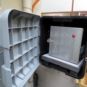 雨避けと盗難防止を兼ね、収納ボックス内に設置しています。