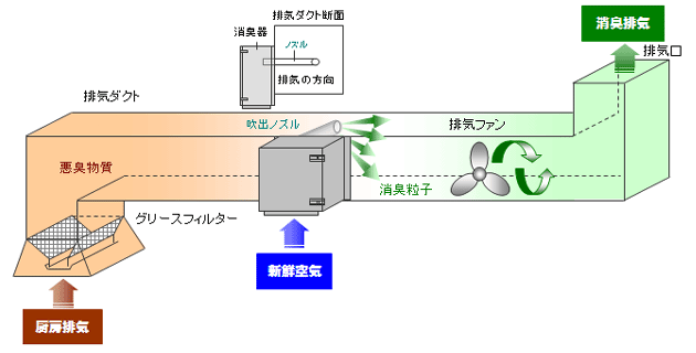 メンテナンスも簡単な、排気ダクトの側面に直付けできる中和消臭器 DC-6SⅡが採用されました。