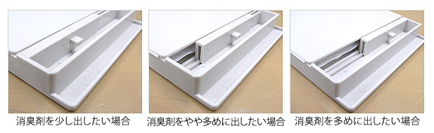 消臭剤ケースにスライド式のツマミがありますので、お好みに合わせて発散量を調整してください。