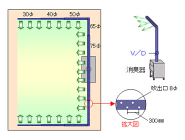 室内を囲むように吹出口を配管します。消臭器は塩ビ配管仕様でご注文ください。