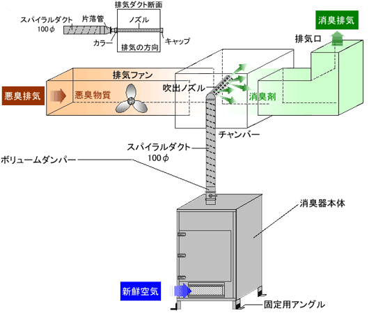 排気ファンの後(ダクト正圧側)にノズルを挿入する場合は、チャンバーを設けてダクト内の風速を低下させる(3m/秒以下が望ましい)と、消臭剤と悪臭物質が接触・反応しやすくなります。